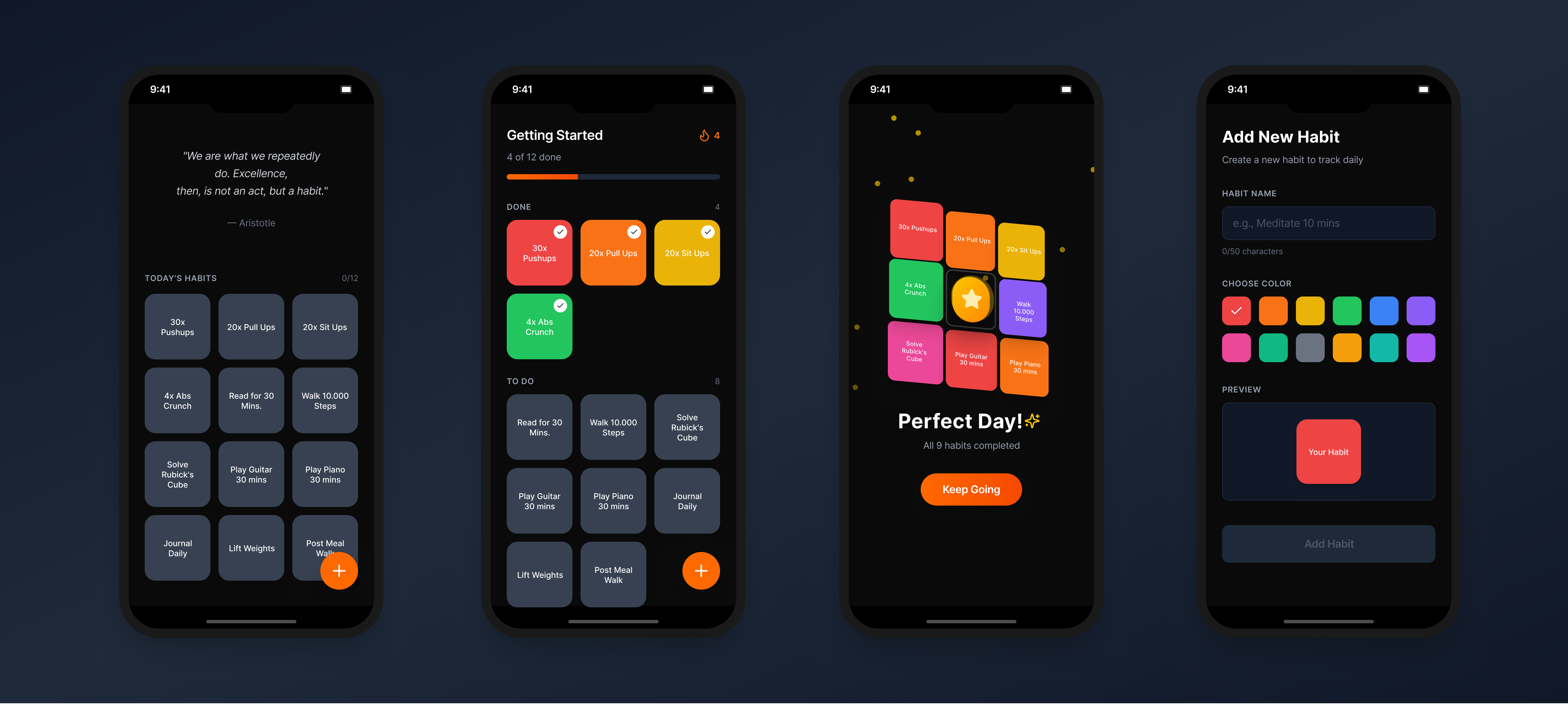 The HabitsCube interface is built from modular components that work together to create a cohesive user experience. Below are the four primary screens showing the app in action.